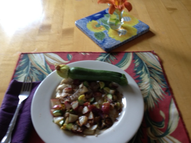 Tiny new red potatoes that could almost be eaten raw (maybe some folks do?), first tomatoes of the season, purple onions that glistened with freshness, and just-the-right-size zucchini. I’m told that squash blossoms are a delicacy. People go to Beech Hill Farm asking for just the blossoms. I was adventurous, sauteing one with my veggies for dinner. Edible, yes, but I’m not sure I’d call it a delicacy.