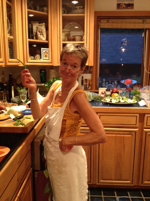 Back at her house, we sip white wine. She starts the process of preparing the salad. Two and a half hours later, we sit down with more wine, candles lit, looking out at her garden and the woods beyond.