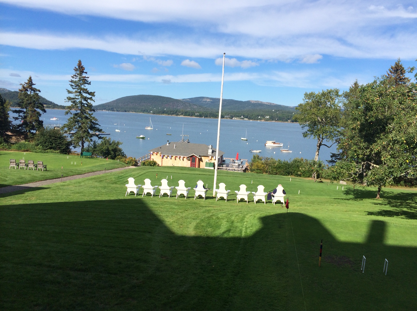 Today, Olivia and her husband are visiting Mount Desert Island, following a week on Great Cranberry Island, across the Western Way. She sent this fabulous photo of one of my favorite places in Southwest Harbor (maybe on the planet?), the Claremont lawn (looks down to the boat house, where we go for cocktails in the summer. The Claremont Inn isn’t in the photo, only its shadow).